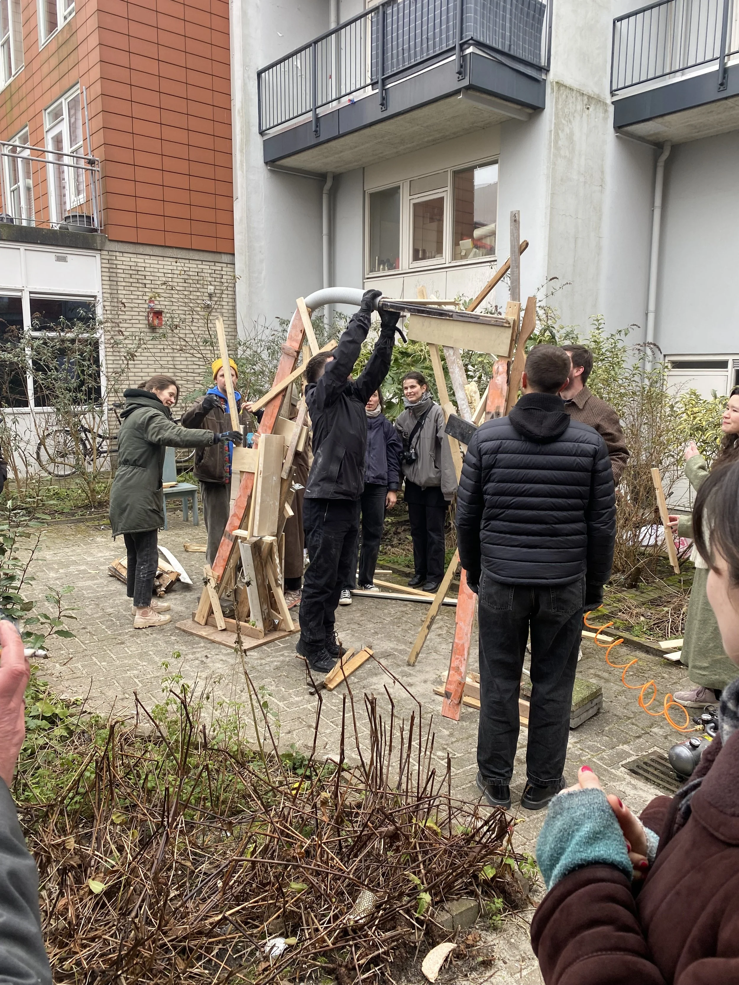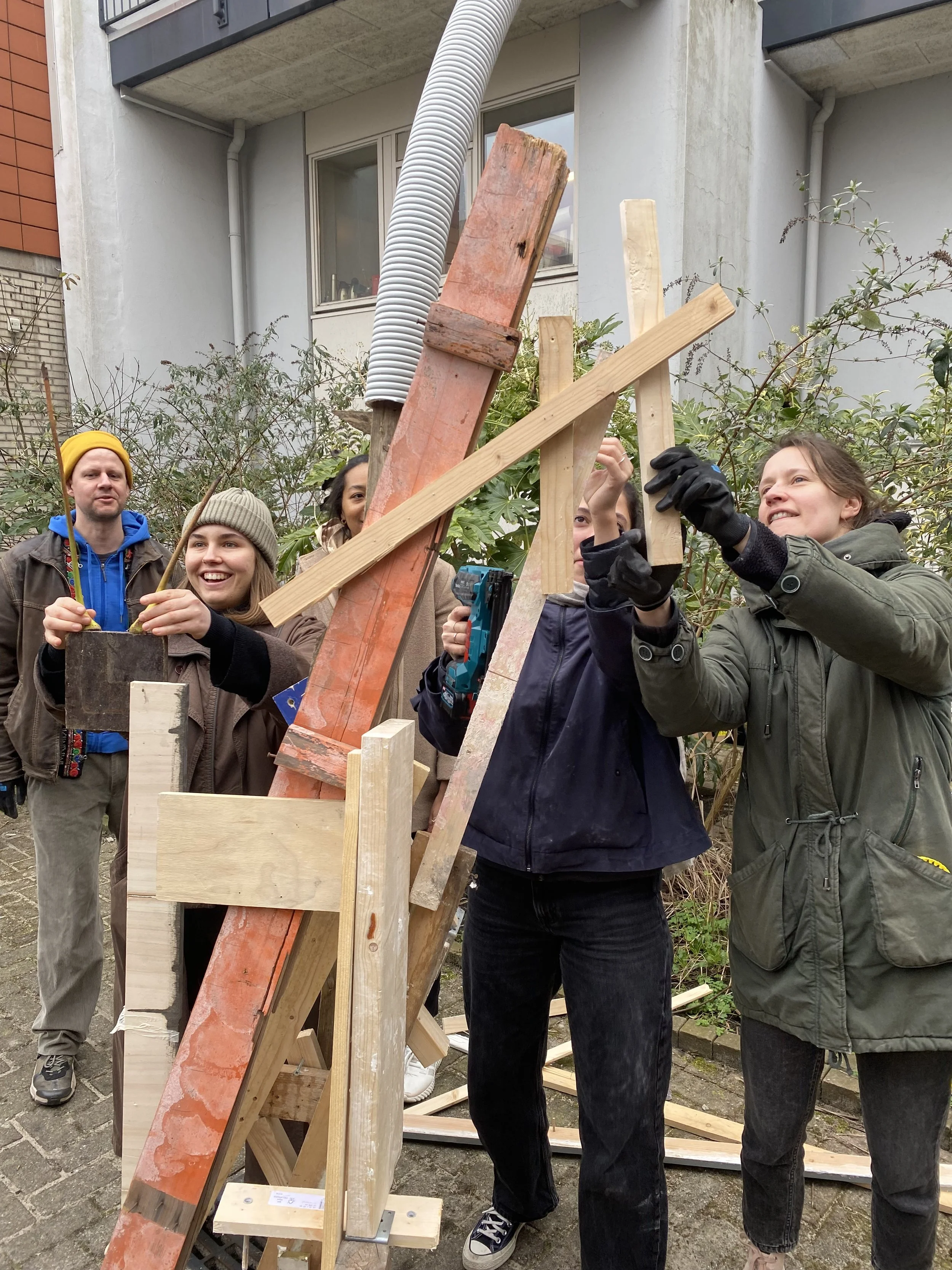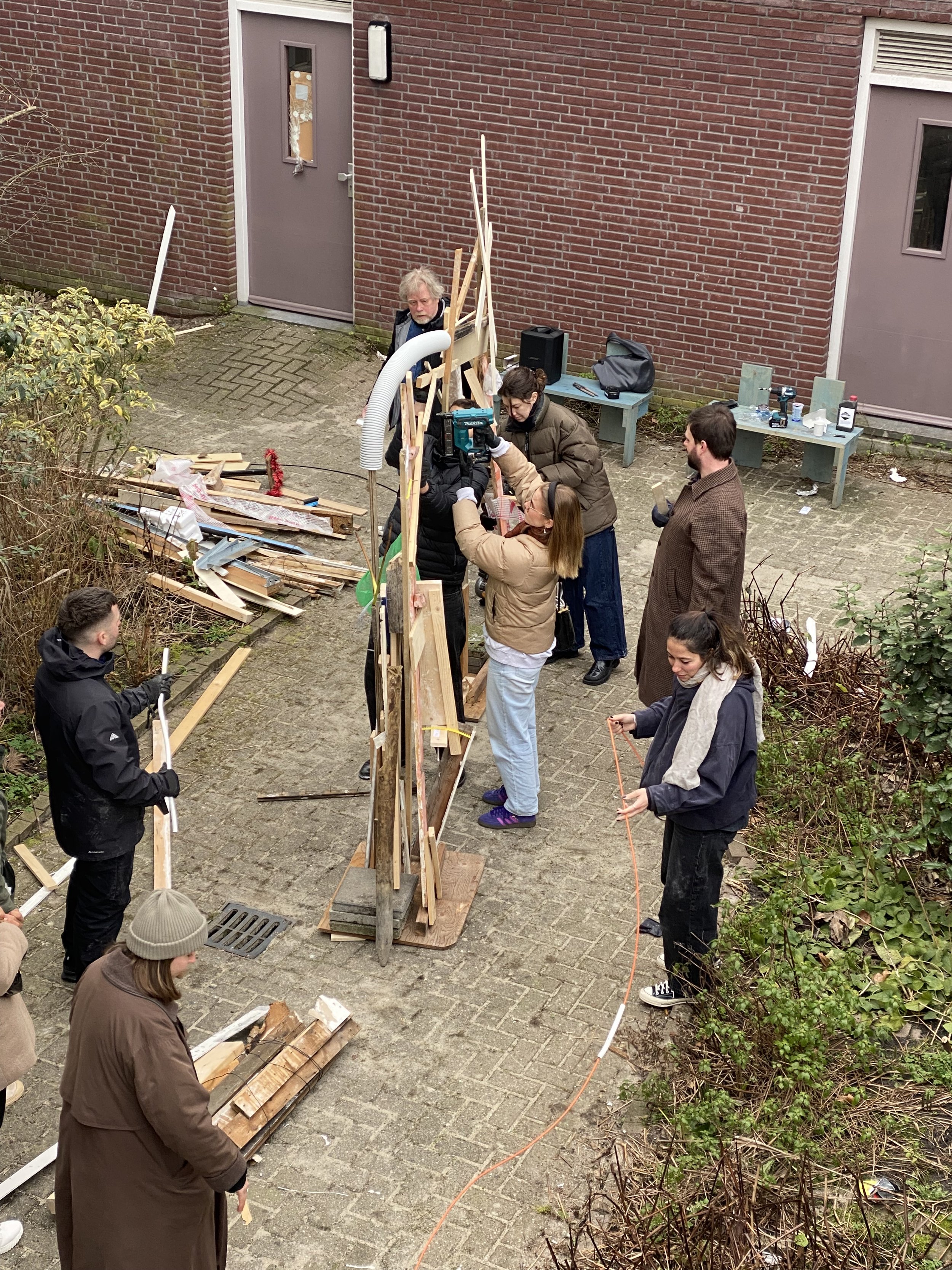 Phase 2: Co-Creation - Back at the gallery, we used the gathered materials to build a single, co-created structure. Armed with two nail guns, participants took turns of five minutes, working quickly and intuitively. The challenge was to embrace instability and constant repair as central features, rather than flaws, engaging in a dynamic, playful, and improvisational process of collective assemblage.
