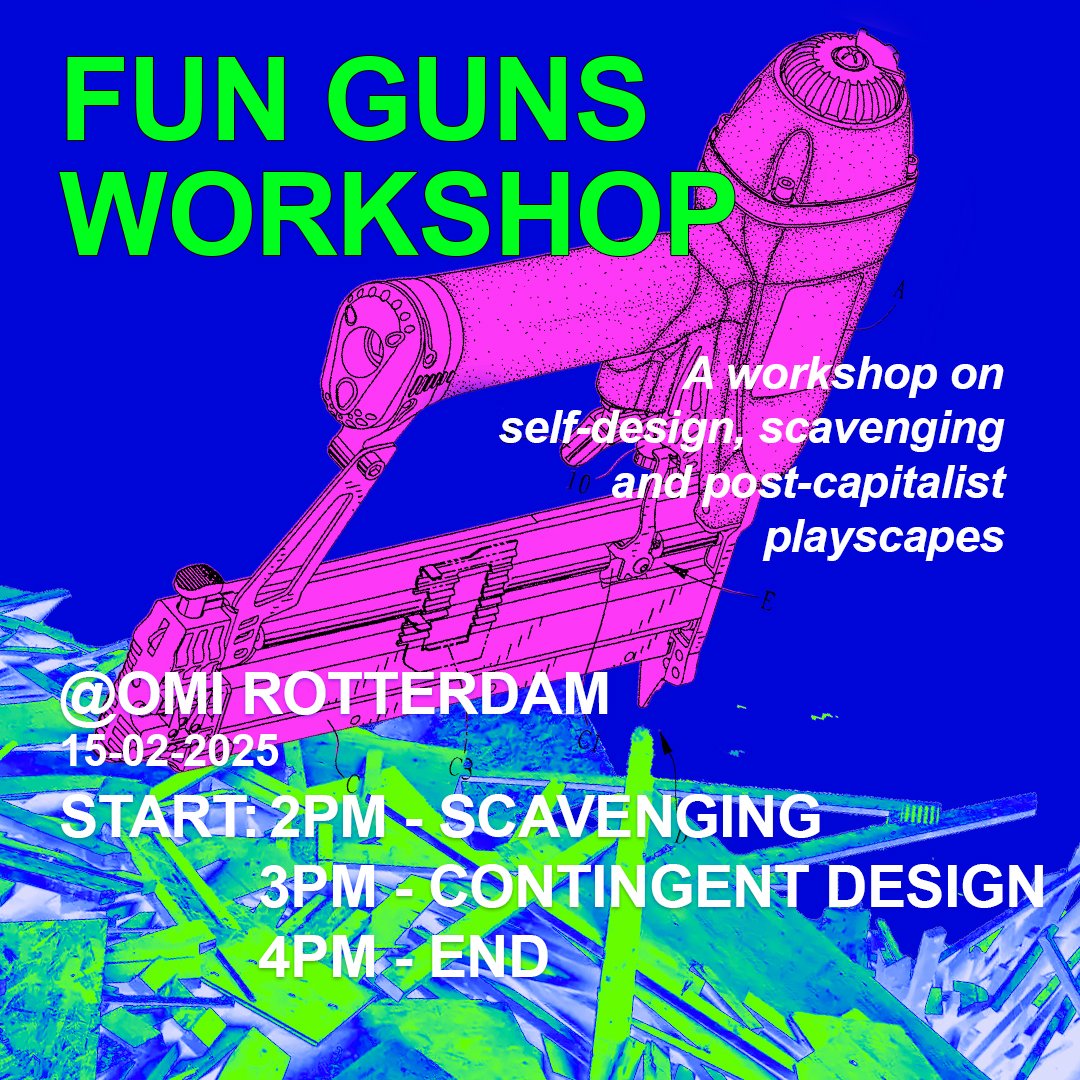 βAre you tired of sitting in an office, disconnected from the tangible outcomes of your work? Do you question the promise of happiness endlessly deferred to some distant future? What about today? What about now? What about the urgency and desire to create, just waiting to be unleashed? There is no time to waste! Join the Fun Guns workshop at OMI and experience the joy of instant creation through hands-on activities guided by one simple rule: no plan, only play. Together, we will explore how improvisational building with waste materials can unlock the immediacy of the creative process. By stripping away hierarchies, extractive systems, and standardized components, we prioritize improvisation, adaptability, and trial and error, and emphasize autonomy and self-building as tools for community empowerment.β