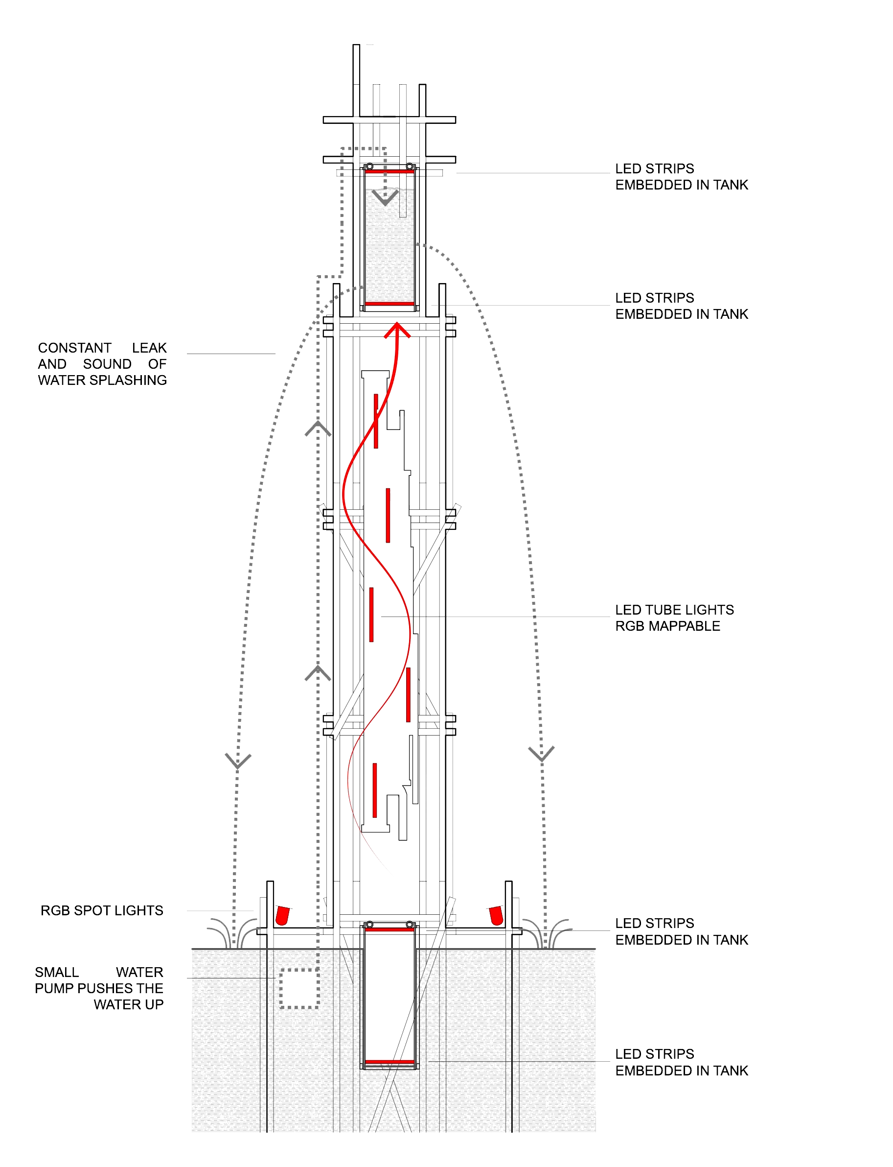 The installation emerges from the water and consists of three light components: a submerged volume of air, a sculptural piping assemblage made from reused piping waste, and an elevated volume of water. Together, these three components form a continuum of light, which suggests movement from below the water to above. It reminds me of a lighthouse, a tower, a candle. At night, a glow emerges from within the canal, intriguing passersby. This light follows the piping structure, shining intensely towards the sky. The tank glows like a beacon against the dark.