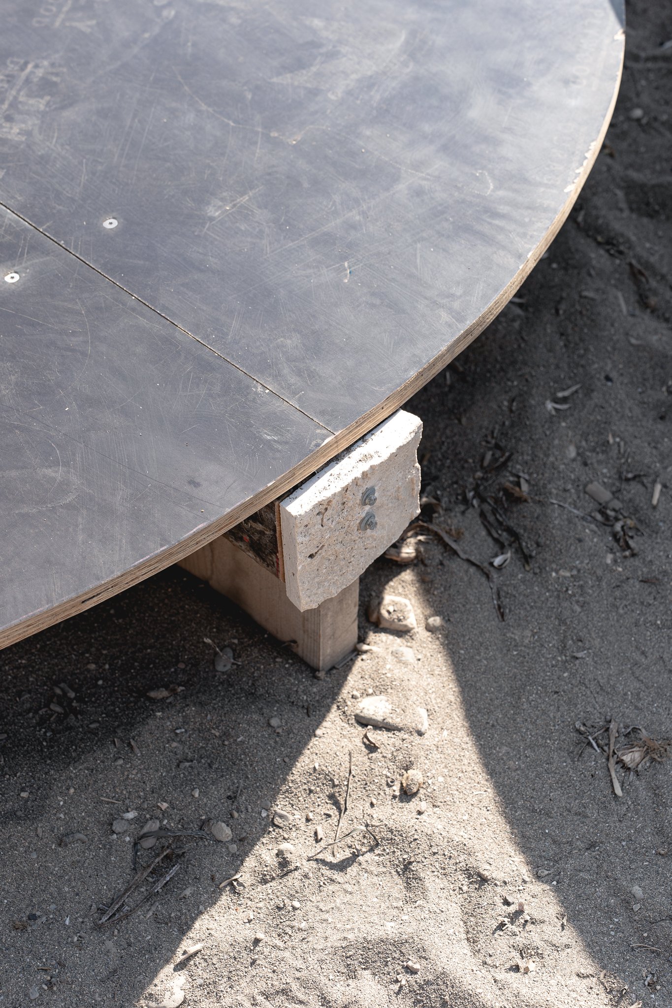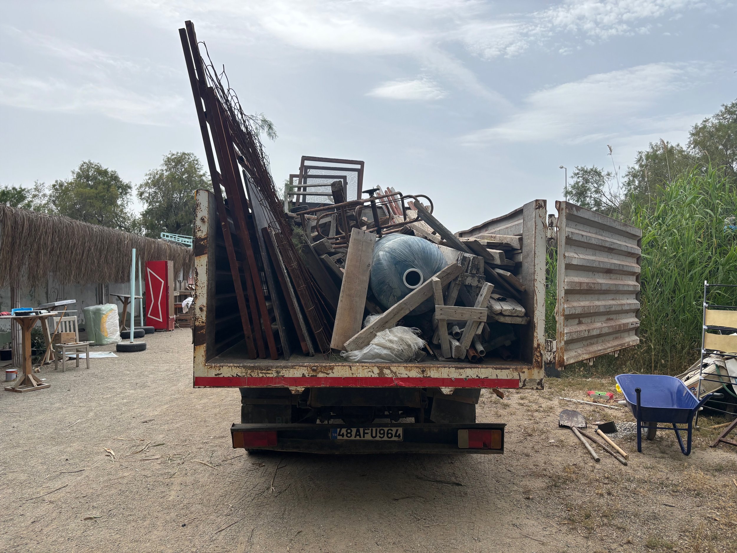 Built from waste and second-hand materials sourced across Bodrum, the project is a research–design–education program supported by the French Embassy. It responds to mass tourism, pressure on natural heritage, and weak waste systems by making circular design public, functional, and beautiful. Co-produced with municipalities, landfills, shipyards, craftspeople, students, and festival partners, the design was shaped by what was found and built collectively. Open, modular, and detachable, the platform lets structure be floor and scenography at once, limiting visual noise in elevation to foreground the sea and sun as backdrops. The columns archive local construction waste; their bases—cast in sand moulds on-site with demolition rubble—quietly echo nearby ruins and the fragile link between cultural and natural heritage.